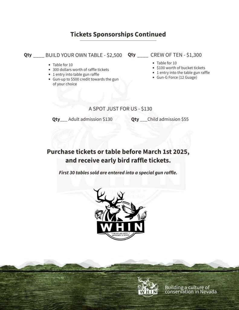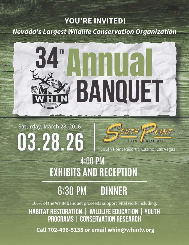 Wildlife and Habitat Improvement of Nevada is a non-profit sportsmen and conservation organization devoted to the maintenance and betterment of Nevada’s wildlife populations and their habitat. WHIN is a hands-on organization. Many of the members devote countless hours providing the manpower necessary to carry out work projects and to plan and execute the annual banquet and other social activities. WHIN is an organization that your whole family can enjoy and become active in. We encourage everyone to participate. Unlike many other worthwhile groups who work on behalf of wildlife, WHIN is a NEVADA organization, and retains 100% of the money it raises for projects and activities within the state. Funds are raised through membership fees, donations, and by auctions and raffles at the Annual Banquet, and other times throughout the year.