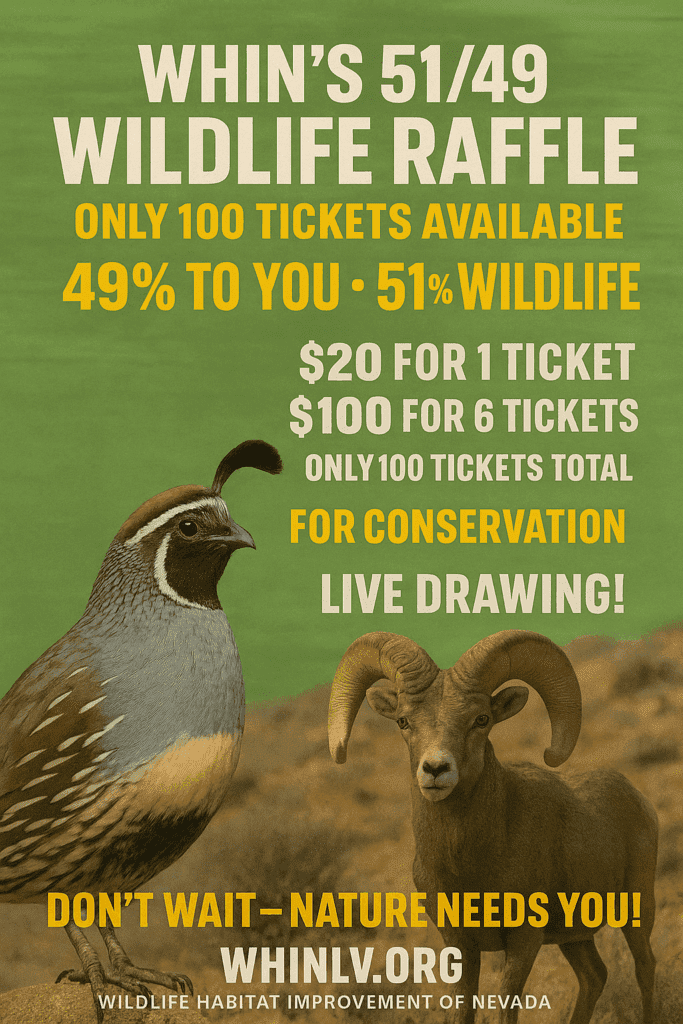 Wildlife and Habitat Improvement of Nevada (WHIN) is having our annual fund-raising banquet this 11th of March 2023, at the New Orleans Hotel and Casino in Las Vegas, Nevada. We invite you and your business to participate in this fun-filled event. Any donations of services, cash, merchandise, corporate sponsorship, and banquet attendance are valuable in achieving our goals of conserving and maintaining ALL of Nevada’s wildlife.