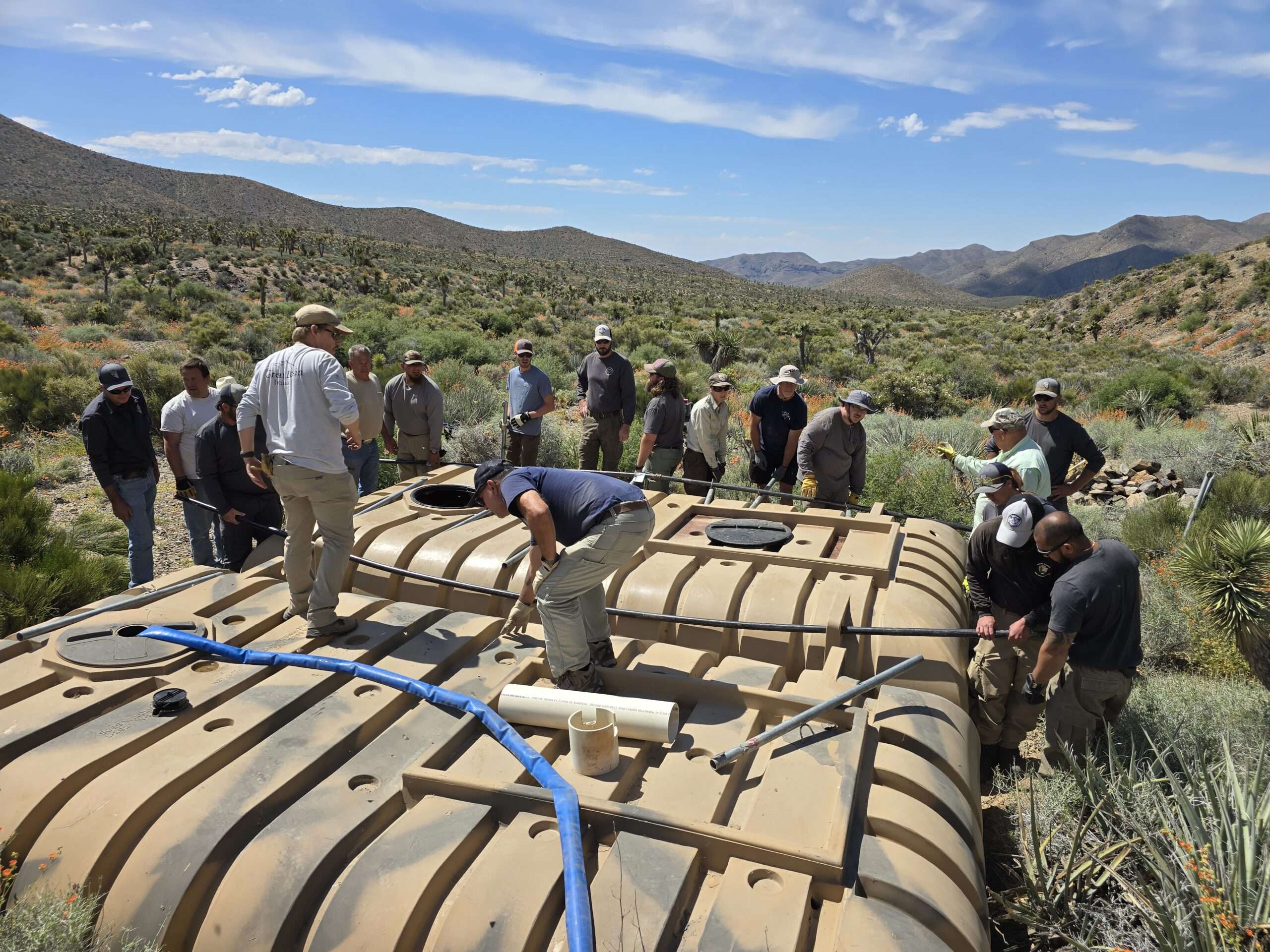 The Quail Springs Guzzler Rebuild project, located in the Desert National Wildlife Refuge, involved the restoration of a vital water source for local wildlife. The crew replaced the guzzler’s apron, installed new water tanks, and secured a reliable water supply to support the area’s ecosystem. This effort ensures that wildlife in the region will have consistent access to water, especially during dry periods, promoting the health and sustainability of the habitat. The project site is accessible via Quail Spring Road, with 4WD recommended for the steep terrain near the trailhead.